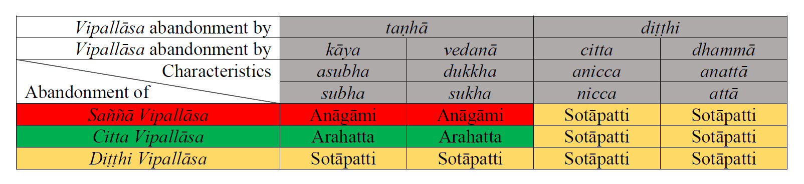 KeymasterNote that the chart in the post is only about the removal of vipallasa. As I emphasized, vipallasa about Tilakkhana are different from deeper level of understanding of Tilakkhana.