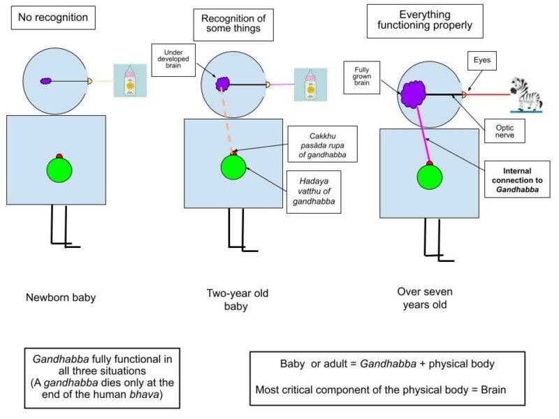 - But when the gandhabba is inside the physical body, it is completely shielded from the external world; the physical body must function well to transmit sensory signals to the gandhabba trapped inside. Take vision first. To see something, the physical eyes must work. That light signal must be transmitted to the brain via optical nerves and processed by the brain. The brain MUST pass that information to the gandhabba (by a mechanism we don’t fully understand).
